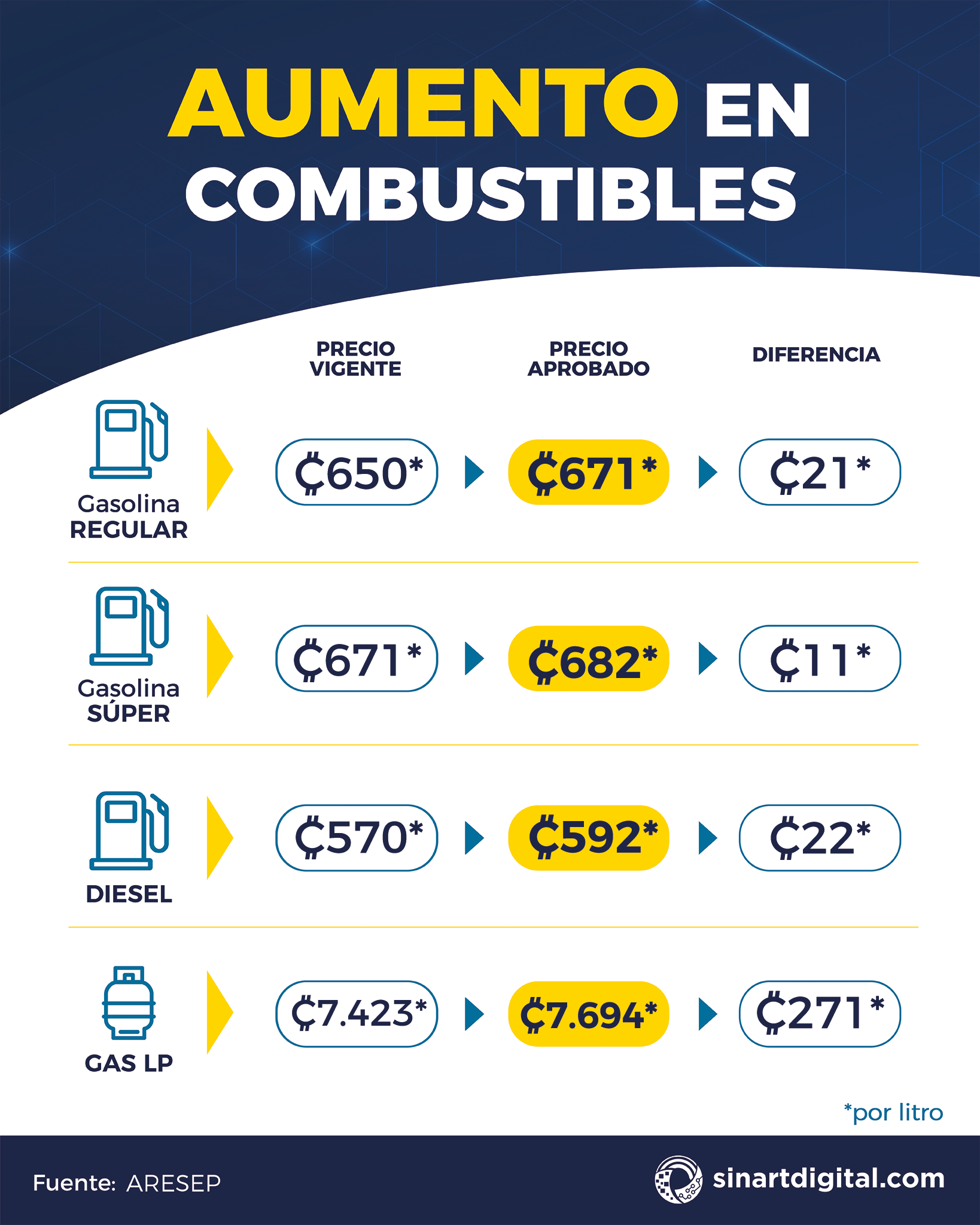 ARESEP aprueba aumento de entre ¢11 y ¢22 por litro en el precio de los combustibles