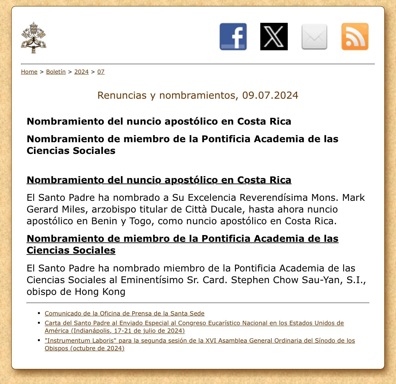 El Papa Francisco nombró a Mons. Mark Gerard Miles como el nuevo Nuncio Apostólico en Costa Rica. Mons. Miles, Arzobispo titular de Città Ducale, se desempeñaba previamente como Nuncio Apostólico en la República de Benín y en la República Togolesa.