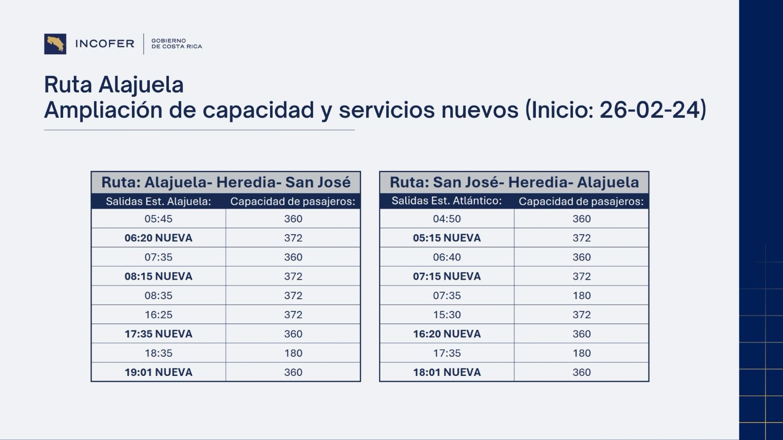 "Ante la emergencia vial, Incofer ofrece una alternativa de transporte a las personas que se trasladan entre Alajuela, Heredia y San José, por lo que hemos realizado una reestructuración de nuestros equipos para lograr duplicar la capacidad en la ruta Alajuela y también ofrecer ocho servicios más por día, sin afectar la operación actual en todo el sistema ferroviario de pasajeros", apuntó Álvaro Bermúdez, presidente ejecutivo de esa institución.