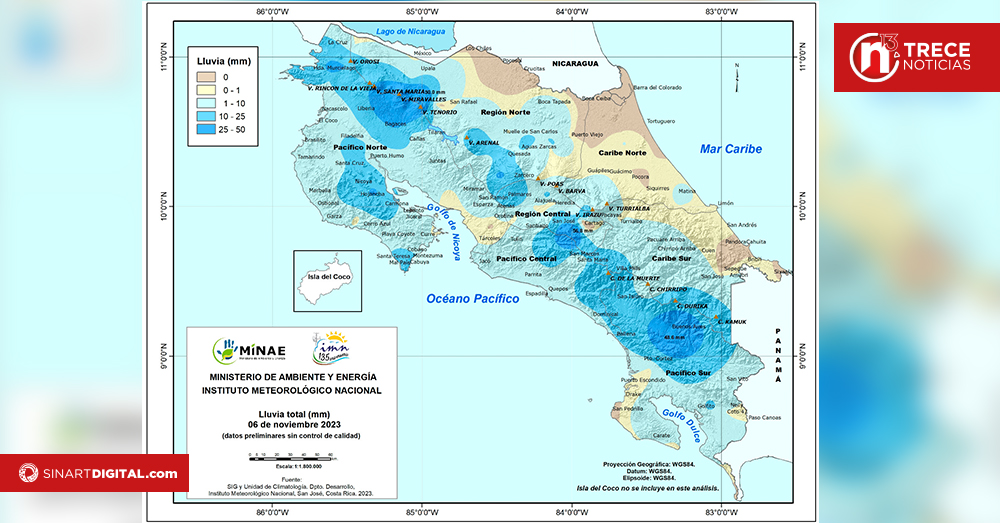 De acuerdo con el Instituto Meteorológico Nacional (IMN), durante la tarde del lunes, se presentó un acumulado de lluvia importante en El Guarco. De hecho, precisó, se dio el más alto de todo el día en todo el país: en total, fueron 56.8 litros por metro cuadrado.