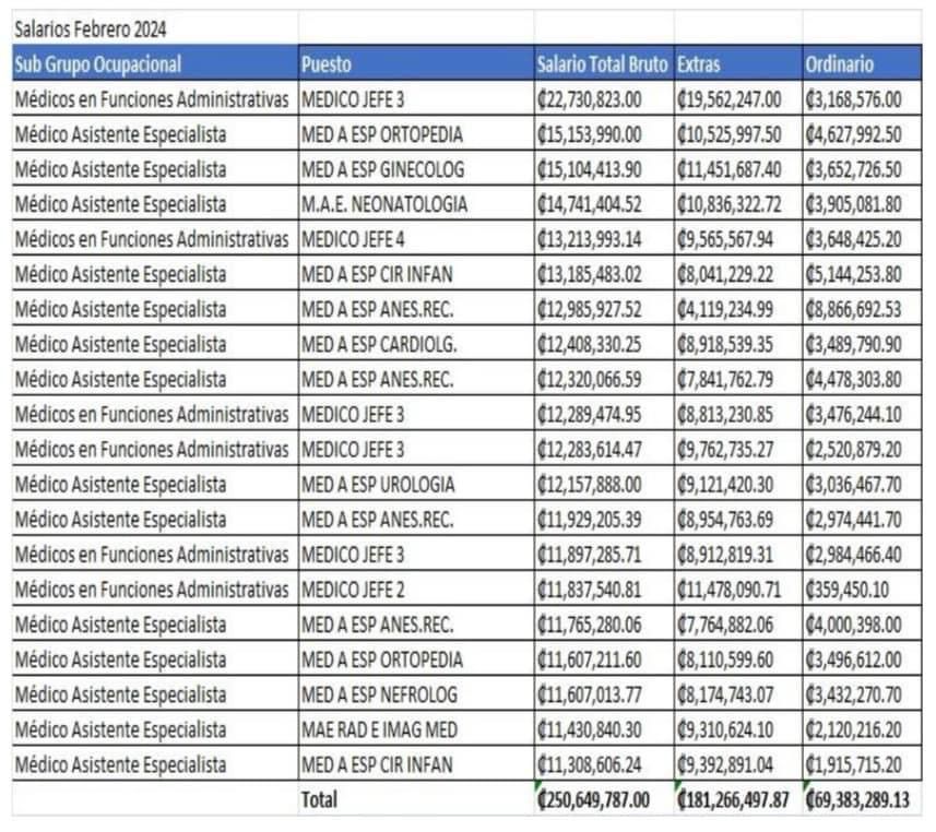 La Asociación pro derechos de consumidores, contribuyentes, asegurados, administrados y propietarios (Aprocap) difundió una lista de salarios que indica el salario base y los montos que factura cada profesional en extras.