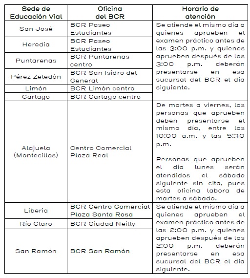 Las personas que aprueben el examen práctico de conducir, pueden solicitar la impresión de su licencia en las sucursales del Banco de Costa Rica (BCR) el mismo día, tras finalizada la prueba.