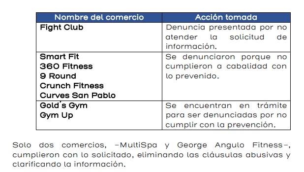 Los gimnasios Fight Club, Smart Fit, 360 Fitness, 9 Round, Crunch Fitness y Curves San Pablo han sido denunciados ante la Comisión Nacional del Consumidor. Gold's Gym y Gym Up están en trámite de denuncia. MultiSpa y George Angulo Fitness eliminaron las cláusulas abusivas, evitando así la denuncia.