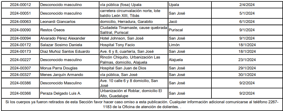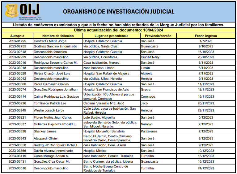 El Organismo de Investigación Judicial (OIJ) compartió la lista de 34 cuerpos que se encuentran en la morgue judicial y aún no han sido reclamados.