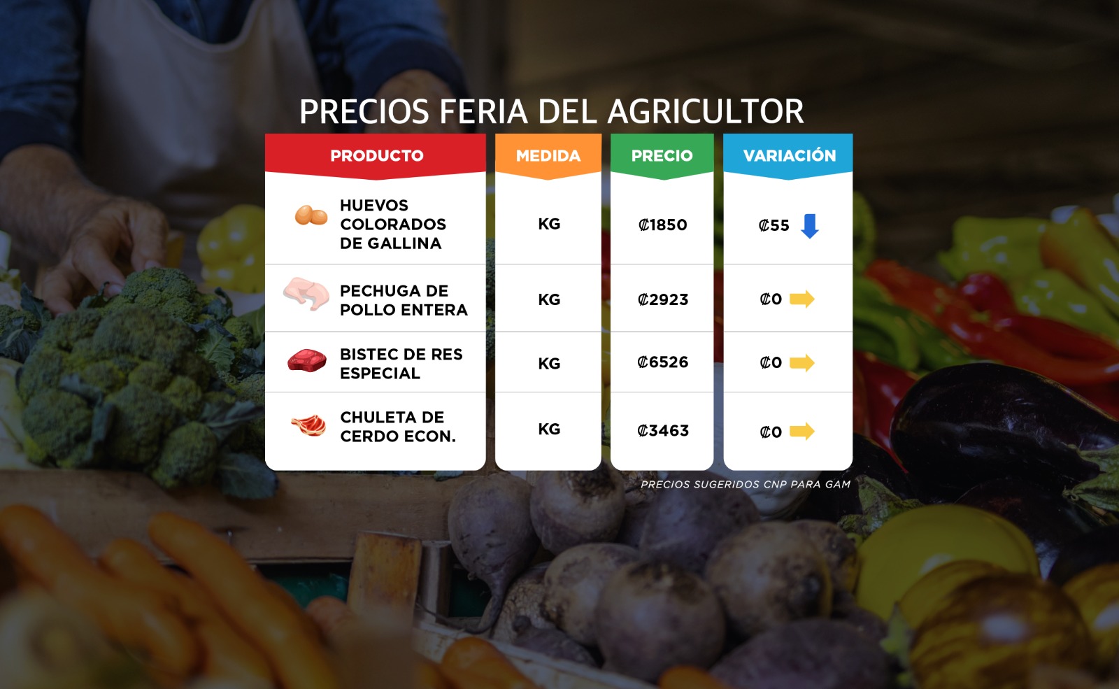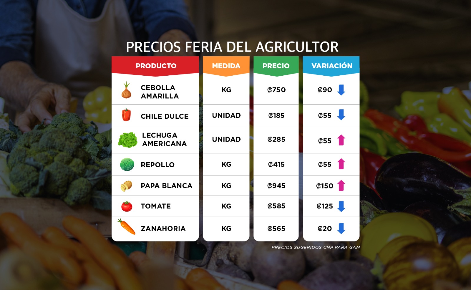 A continuación, le presentamos los precios de la lista de precios del Consejo Nacional de Producción (CNP) para la feria del agricultor de este fin de semana para el GAM.
