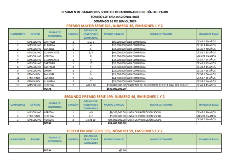 El premio mayor, correspondiente al número 38 con la serie 621, se vendió en su totalidad en el sitio web oficial de la JPS (www.jpsenlinea.go.cr). Doce personas compraron fracciones de este número y están en trámite de recibir su premio.