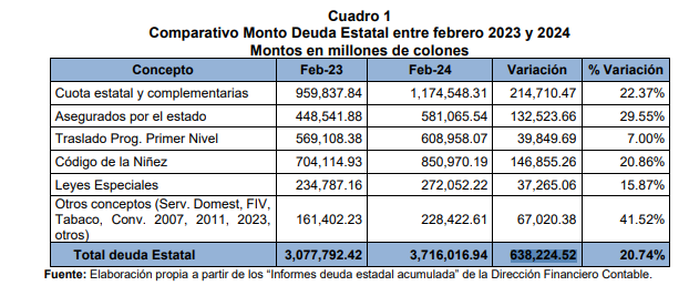 El informe AI-0567-2024, extendido por la auditoria de la CCSS al despacho de la diputada Ramírez, en tan solo 12 meses la deuda creció ₡638,224.52, lo que representa un incremento del 20.74%.