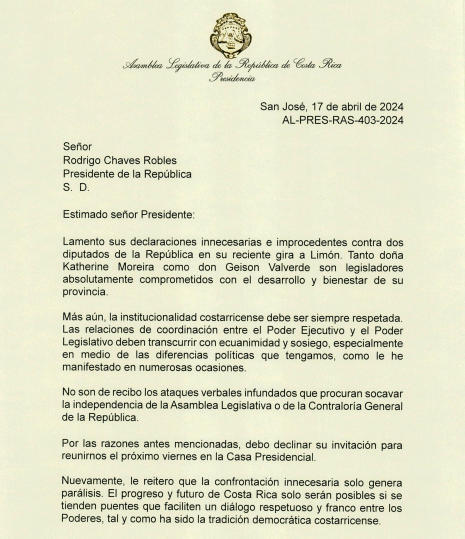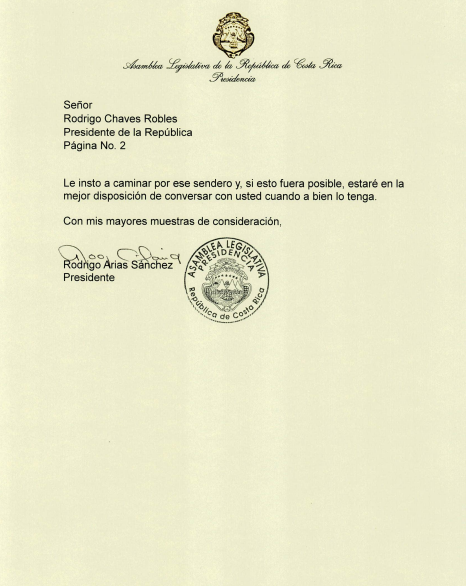 A través de una carta, Arias critica la postura del Presidente Chaves y recalca la importancia del respeto y la coordinación entre los poderes del Estado, enfatizando que la confrontación podría conducir a una parálisis gubernamental.